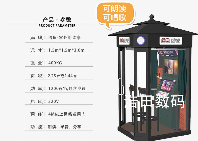 朗讀亭伴隨著央視中央電視臺(tái)開年力作,大型文化情感節(jié)目《朗讀者》的籌劃應(yīng)運(yùn)而生、朗讀亭外觀古樸、比普通的電話亭要稍微略大一些,上面寫著大大的“朗讀亭”字樣,24小時(shí)開放。內(nèi)部工作臺(tái)、電源、燈飾、插座及一套完整的錄音設(shè)備。廣州浩田為客戶提供室外朗讀亭加盟渠道,為您解答朗讀亭價(jià)格費(fèi)用、朗讀亭免費(fèi)使用嗎、室外朗讀亭怎么使用等問題。