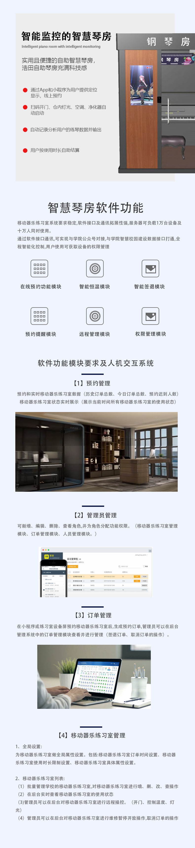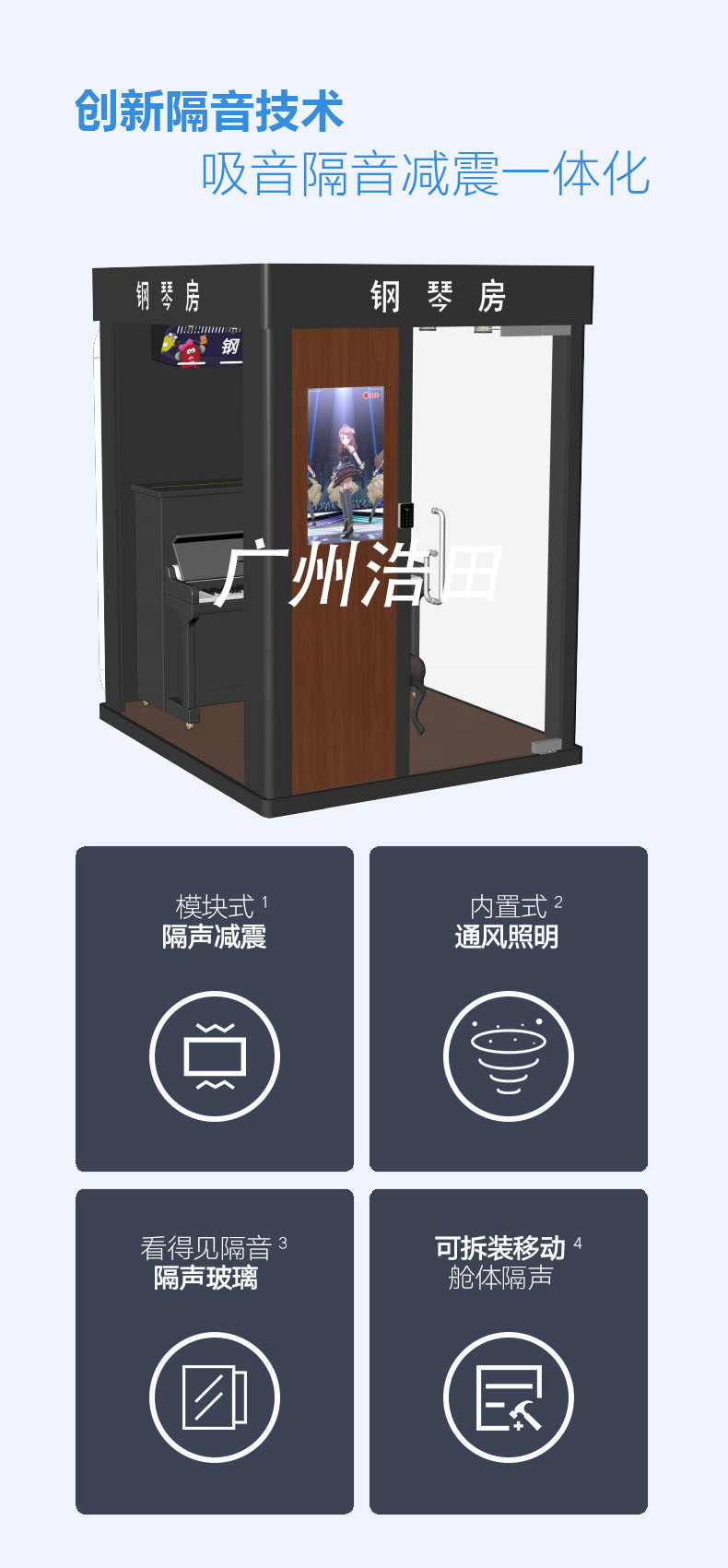 產(chǎn)品特點(diǎn):可以通過App和小程序?yàn)橛脩籼峁┒ㄎ伙@示,線上預(yù)約、掃碼開門、倉內(nèi)燈光、空調(diào)、凈化器自動(dòng)啟動(dòng),自動(dòng)記錄分析用戶的練琴數(shù)據(jù)并輸出建議指導(dǎo),用戶按使用時(shí)長自助結(jié)算,是一款很實(shí)用且便捷的自助智慧琴房,浩田自助琴房令充滿科技感.