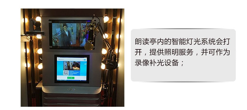2、朗讀者進(jìn)入朗讀亭后,朗讀亭內(nèi)的智能燈光系統(tǒng)會(huì)打開,提供照明服務(wù),并可作為錄像補(bǔ)光設(shè)備;