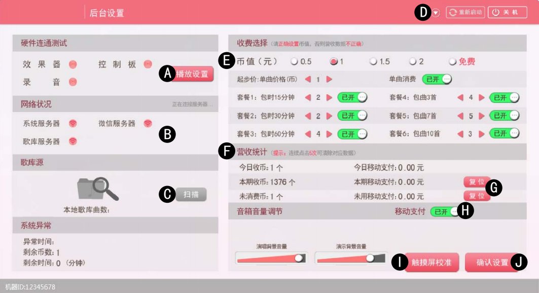迷你ktv房收費多少錢一首歌設置_迷你ktv房調節音量,可以在通過按控臺左上角的“功能”按鍵進行操作,3秒內按下投幣門上的“測試”鍵進入;退出時,按觸摸屏上的返回按鈕退出。當日營收統計時間段:6:00AM-(第二天)6:00AM。