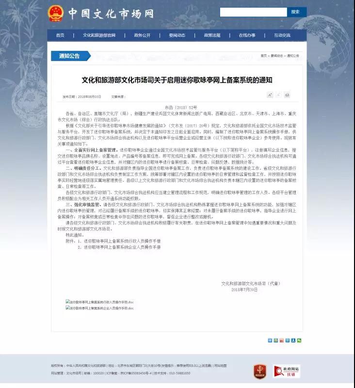 與此同時,也出現了設備安全難保障、衛生環境較差、歌曲內容違規或者侵權等問題,針對這些問題,2017年,文化和旅游部發布了《文化部關于引導迷你歌詠亭市場健康發展的通知》,全面規范了迷你歌詠亭市場,近日,文化和旅游部文化市場司印發了《關于啟用迷你歌詠亭網上備案系統的通知》,通知要求各相關部門全面實行網上備案管理,并明確了權責分工,規范了迷你歌詠亭的日常管理和監督檢查工作。此消息一出,一石激起千層浪。